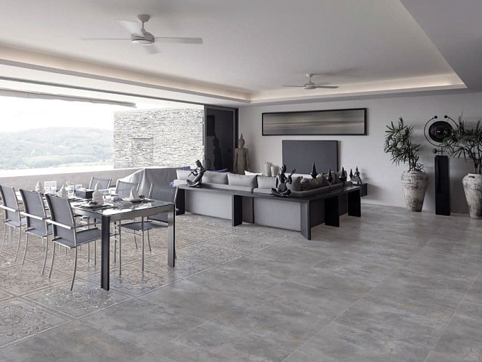 Спокойная и монументальная коллекция Absolut Keramica Layen создана для индустриальных интерьеров. Керамогранит имитирует текстуру бетонной поверхности со следами машинной шлифовки. Немного романтизма в минималистическую картину добавляет декор, выполненный в стиле майолике. На фоне бетона изображены классические розетки в цветочном стиле.