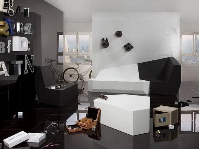 У керамогранита Led ректифицированные края и глянцевая полированная поверхность. Это позволяет создавать сплошные пространства и усиливать необходимый эффект безмятежностью белого цвета и космической глубиной черной плитки. Сочетание форматов 44х44 и 90х90 см позволяет играть с геометрией пространства.