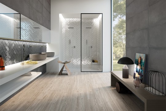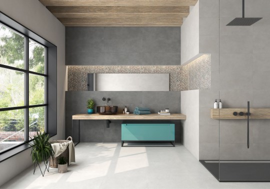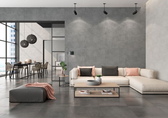Эффектное сочетание бетона и натурального камня вдохновило дизайнеров Saloni Ceramica на создание новой коллекции. Спокойную и безмятежную текстуру шлифованного бетона имитирует базовая плитка Kroma. Рельефная плитка с геометрическим волнообразным узором придает интерьеру необходимую динамику.
