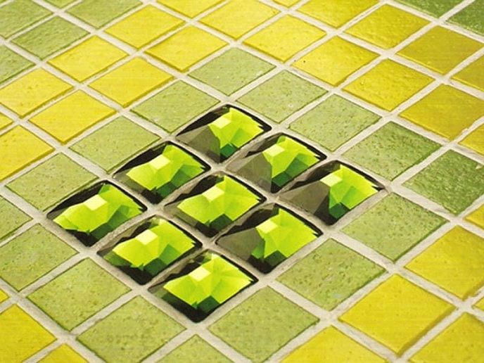 Магическое очарование коллекции Стразы достойно интерьеров в стиле арт-нуво или проектов, имитирующих атмосферу дворцов индийских махарадж. Формат 2х2 см позволяет использовать мозаику для облицовки сложных и объемных поверхностей.
