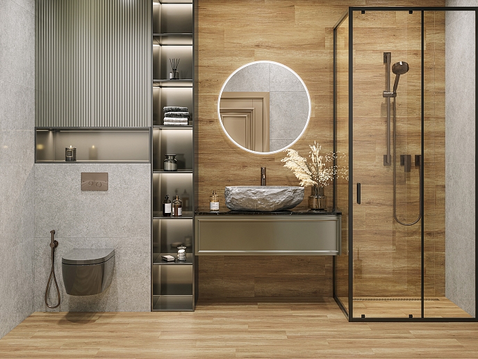 Поверхность: Матовая и слегка текстурированная поверхность плитки создает эффект естественного материала, приятного на ощупь и визуально. Это не только красиво, но и практично — плитка устойчива к износу и легко очищается.