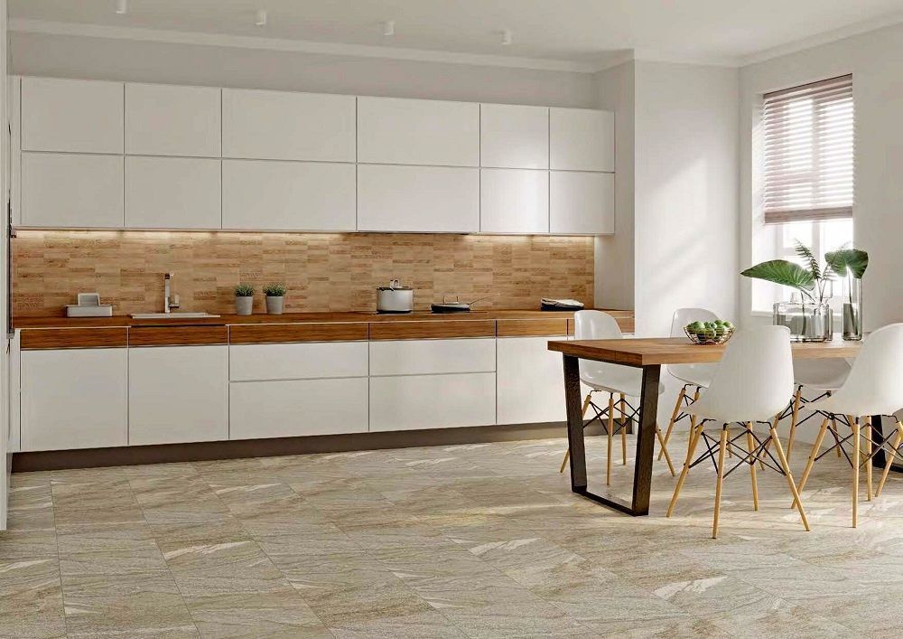 Создать нейтральный интерьер и релаксирующую атмосферу поможет плитка Castello, имитирующая песчаник с эффектными включениями белого кварца. Керамогранит с высокой точностью воспроизводит сложные разводы и прожилки, абстрактную текстуру природного камня. Художники фабрики Grasaro предлагают два оттенка серого для этой плитки. Для каждого цвета разработано 9 паттернов, что помогает создать напольное покрытие с индивидуальным рисунком.