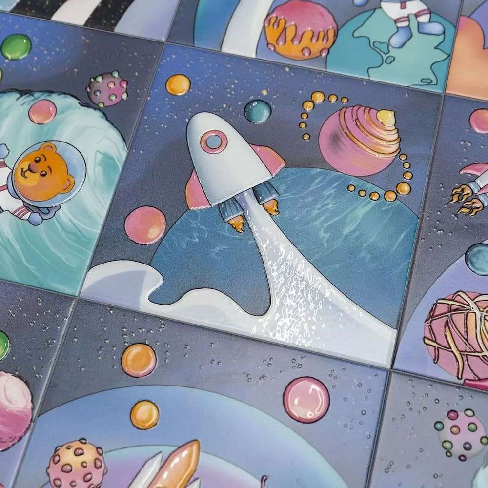 Поверхность: Гладкая глянцевая поверхность плитки создаёт эффект глубины и отражает свет, словно поверхность загадочной планеты. Благодаря этому коллекция визуально расширяет пространство, наполняя его воздухом и легкостью.