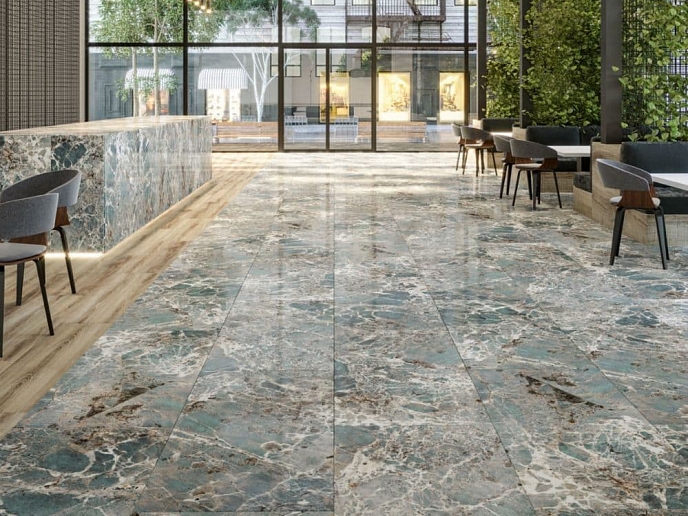 Облицовочный материал производства Qua Granite соответствует модным направлениям в дизайне. Плитка практична в использовании, легко поддается очистке от бытовых загрязнений, красиво играет на свету, переливаясь множеством оттенков, рекомендуется для просторных помещений с небольшим количеством мебели.