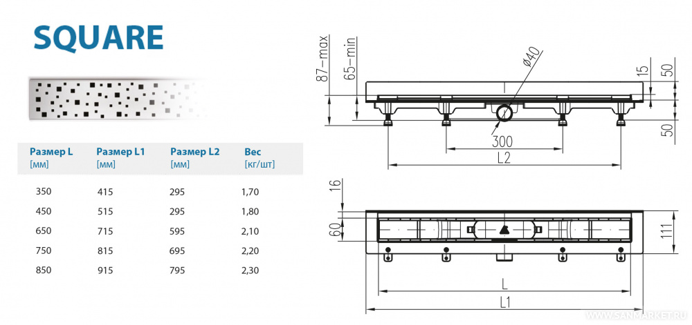 Водоотводящий желоб Alpen Square ALP-850SN2 к стене с рамкой