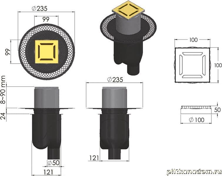Berges Platz Norma Душевой трап 10х10, боковой выпуск, золото