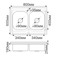 Мойка 8747S Melana 0,8/180 2-я чаша врезная прямоугольная с сифоном (011 ta *7)