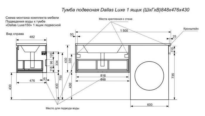 Эстет Dallas Luxe ФР-00009840 Комплект мебели Dallas Luxe 1500х482 правосторонний подвесной 1 ящик 848х476х430