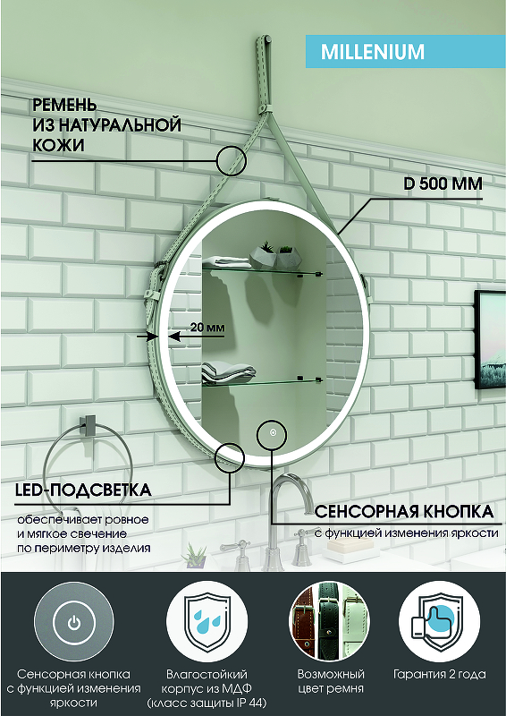 Зеркало Континент Millenium White D500 с подсветкой с сенсорным выключателем ЗЛП963