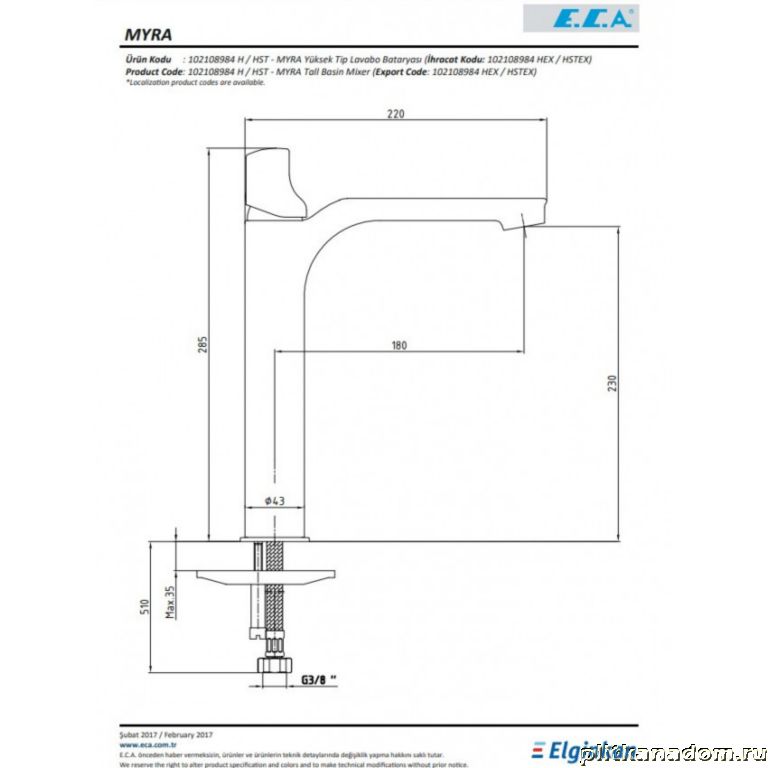 E.C.A Myra 102108984HEX Смеситель для раковины без донного клапана, хром