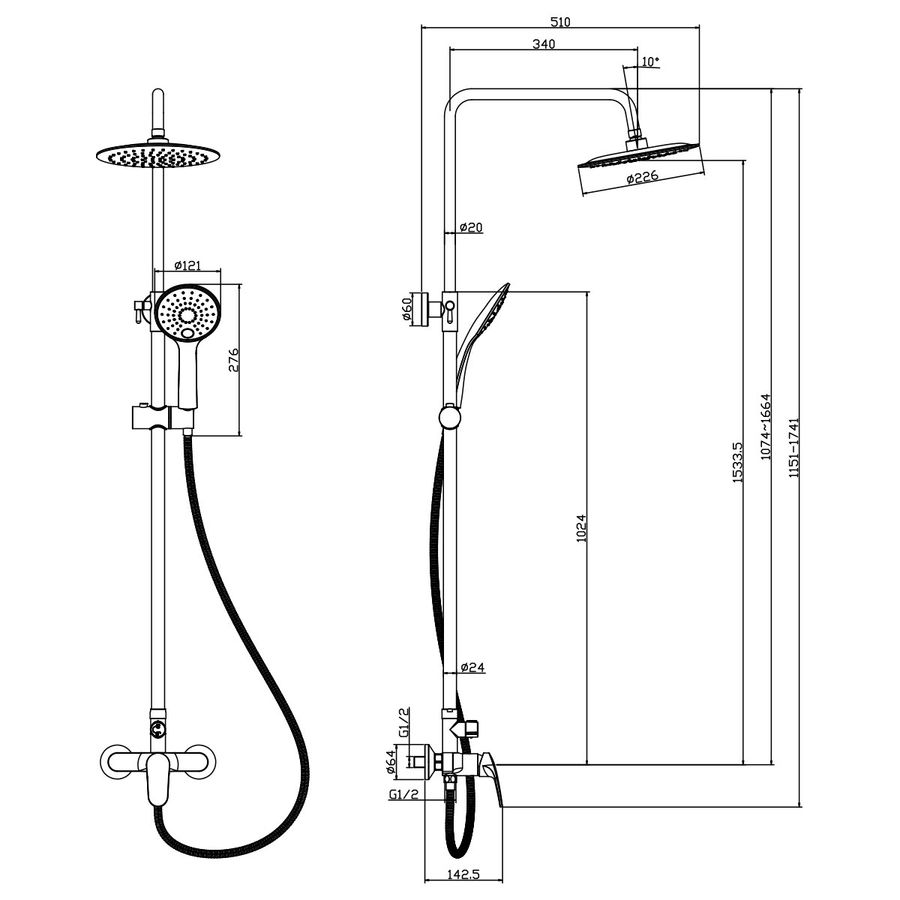 Смеситель Rossinka RS45-45 для душа с регулируемой высотой штанги и лейкой "Тропический дождь"