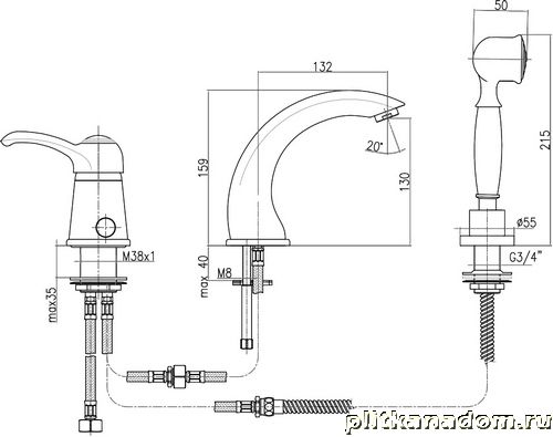 Webert Aurora AU850701015 Смеситель для ванны на 3-и отверстия с ручным душем латунь